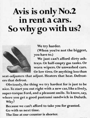 Avis became the no.1 car rental company because of their “We’re No.2 so we try harder” campaign. And they kept on using the same campaign for a long time even after they had become no.1!