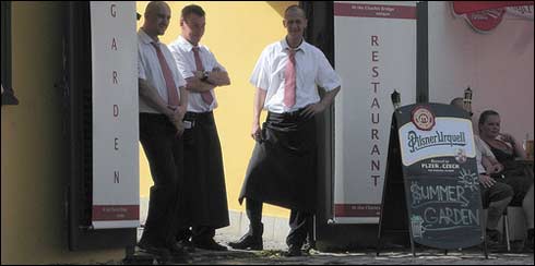When they see someone approaching their door, they go to a table in their area and start wiping it with a towel. They then straighten the condiments and walk away briskly.
